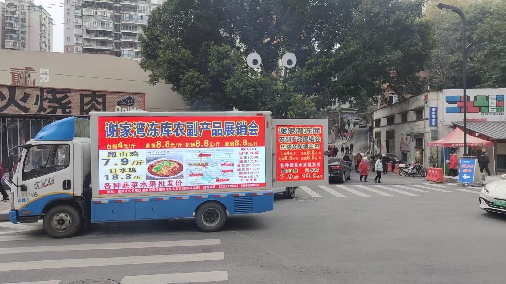 本次巡游以“逛369大集,淘优质副产品”为核心主题,广告车穿梭于九龙坡区谢家湾及周边核心商圈、社区、交通要道,通过高清显示屏循环播放展销会详情。画面中,谢家湾冻库精选的各类优质冻品、特色家副产品逐一亮相,同时清晰标注“每逢农历三六九赶集”的传统习俗与展销会核心福利,搭配轻快的背景音乐与朗朗上口的宣传语,形成全方位、沉浸式的流动宣传矩阵。